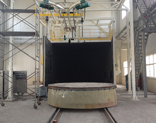 是將承載大型工件的臺車開到拋丸室內后,關閉室體大門對工件進行拋丸清理,拋丸的同時臺車可以做回轉運動或臺車做回轉運動的同時也可做自動往復移動。改產品適用于各種大型鑄件,鍛件結構件的拋丸清理。