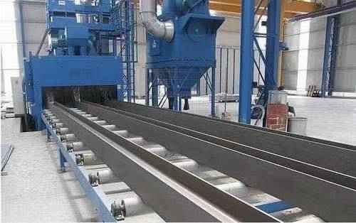 鋼結構拋丸清理機系列產品是針對型鋼和焊接鋼結構件在涂漆前完成拋丸清理達到鋼材預處理標準而設計制造的專用設備。該系列機采用輥道通過式方式設計,主要結構包括:清理室體、輥道系統、彈丸循環系統、拋丸器、尾吹系統、氣動系統、電氣系統和除塵系統。輥道承載工件經輸入輥道運至拋丸清理室,多臺拋丸器運轉加速彈丸轟擊工件表面,有效地去除工件表面銹蝕、氧化皮、焊渣,獲得一定粗糙度及表面壓應力的金屬本色表面,以提高涂漆附著力并延長鋼結構件的使用壽命,達到拋丸清理的目的。工件離開拋射區后,由刮板機構將工件上殘留的彈丸刮除,并由尾吹系統的上噴頭和側噴頭產品高速氣流,將散落的彈丸吹凈,輸出輥道將工件運出以備卸料或涂漆。隨著經濟發展和社會的進步,輕型鋼結構建筑被認為是傳統建筑建材行業中新的經濟增長點,輕鋼建筑所占市場份額正逐年大幅上升。為適應新的市場需求,針對鋼結構件的結構特點和行業需要的特點,青島開發研制了鋼結構拋丸機系列產品,將成熟的拋丸機理念運用其中,在關鍵部件的設計和組合中大量引入本公司多年積累的專業設計經驗和成熟的技術優勢,為促進清理工藝取代污染落伍的酸洗除銹工藝作出了貢獻。