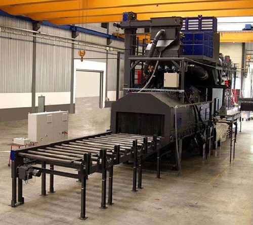 鋼板拋丸機用于造船廠鋼材預處理車間對鋼板和型鋼表面進行除銹、涂漆。主要用于對需要進行預處理的鋼材表面進行除銹并噴涂車間底漆。通過鋼材的預處理,清除其表面的銹蝕、氧化皮和污物,使鋼材具有清潔和一定粗糙度的表面,以增強漆膜與鋼材表面的附著力,從而保證鋼材防腐涂裝質量。機械鋼板拋丸機拋丸處理后的鋼材表面噴涂車間底漆,使鋼材在加工過程中不再二次污染生銹,為最后的涂裝作業保留一個清潔無銹蝕、無污染的表面,保證涂裝質量。